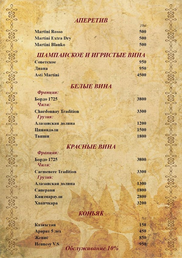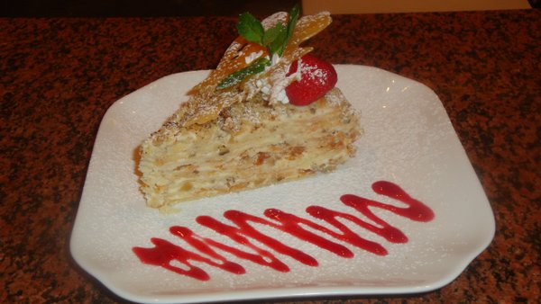 Βладимир Γерасимов (02.07.2012): Десерт 1. Фруктовое ассорти 1500 2. Медовый с орехами 300 3. Наполеон(домашний торт по бабушкиному рецепту) 300 4. Птичье молоко 300 5. Ирисовый пудинг(секретный пудинг от шеф-повара с шотландским соусом) 300 6. Черный лес (суфле с кусочками белого и черного шоколада и вишней) 400 7. Тирамиссу (классический десерт из старинного городка Барии(Италия)) 500 8. Мороженое «Торжество» (1 шар) 140 9. Мороженое «Сarte D'or» (1 шар) 200