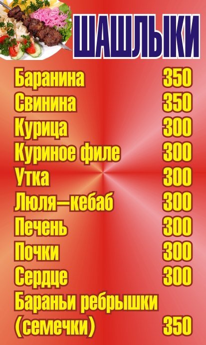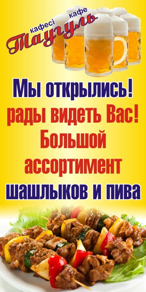 На днях в кафе вводится новое меню с большим разнообразием блюд, шашлыка, напитков, и многого другого. Все это по низким ценам и конечно же большими порциями))))) приходите, мы ждем ВАС))) НАШ Адрес: мкр-н ТАУГУЛЬ, улица Пятницкого 15/16.