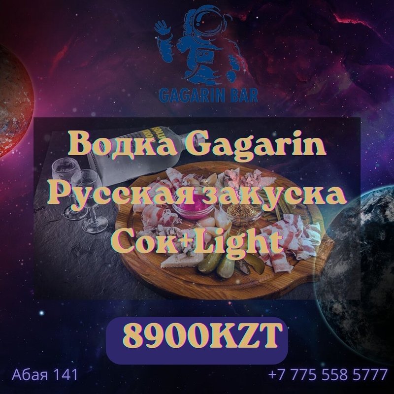 Фирменная водка gagarin Light Натуральный сок Русская закуска Всего за 8900тг.