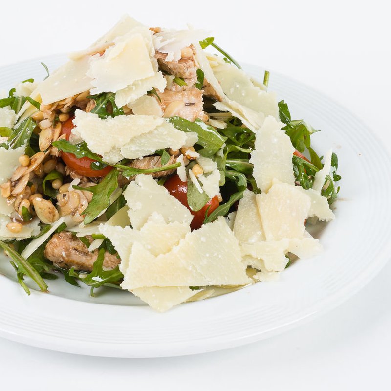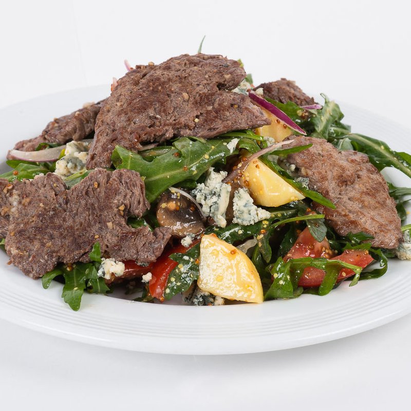 свежие салатные листья,жареная говяжья вырезка,шампиньоны, томаты, сыр Дор - Блю, оливковое масло и ...