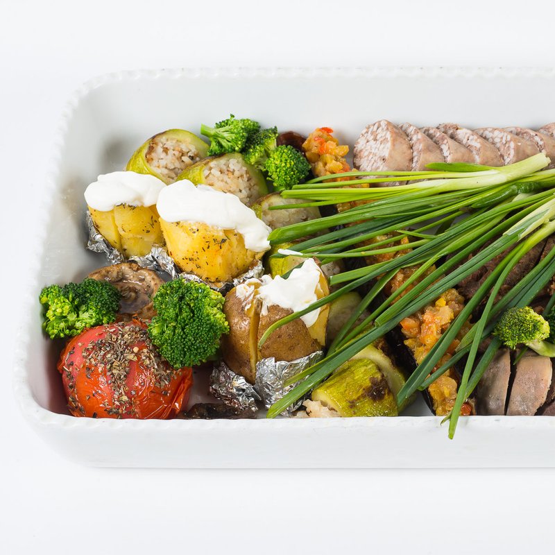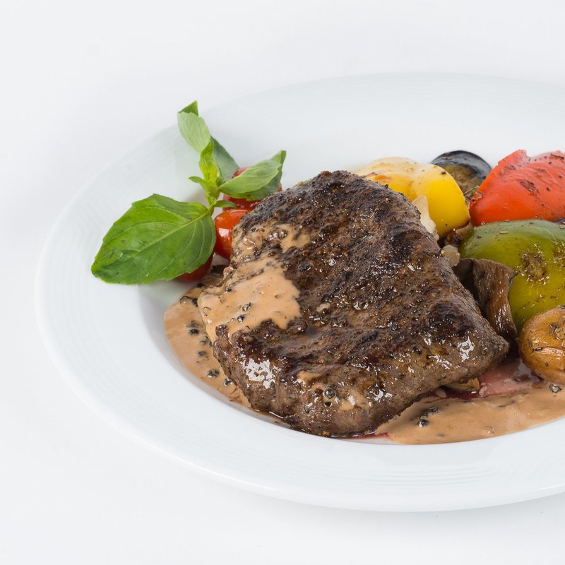 Прожаренный по Вашему вкусу, с соусом из бренди и сливок, гарнированный жаренными на гриле овощами.