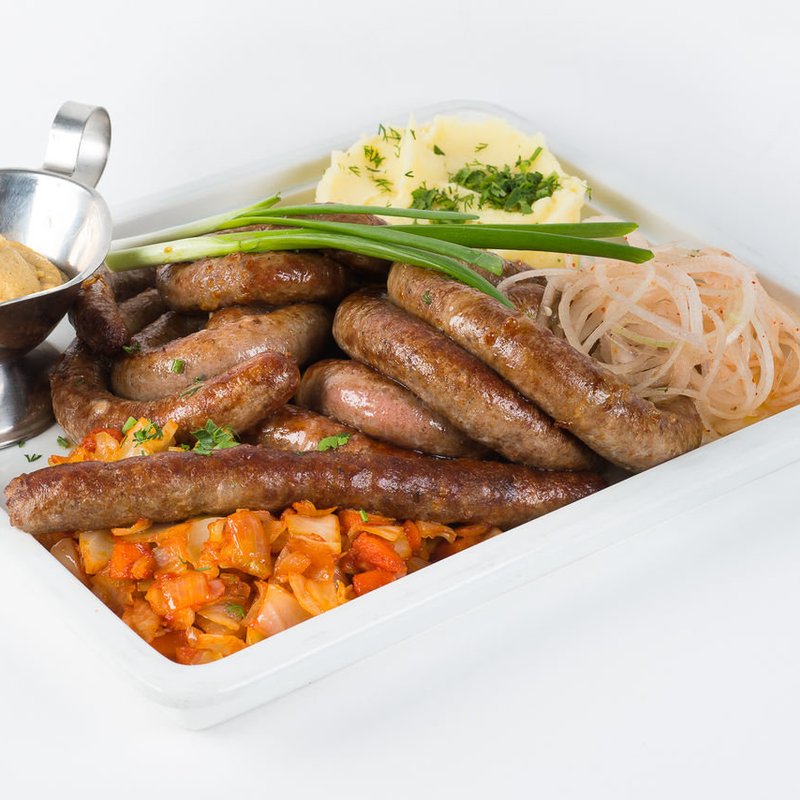 Фирменные колбаски из телятины,ягненка, конины и курицы подается с картофельным пюре и тушеной капустой...