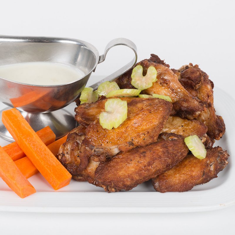 Жареные куриные крылышки с соусом блючиз, с морковью и сельдерем