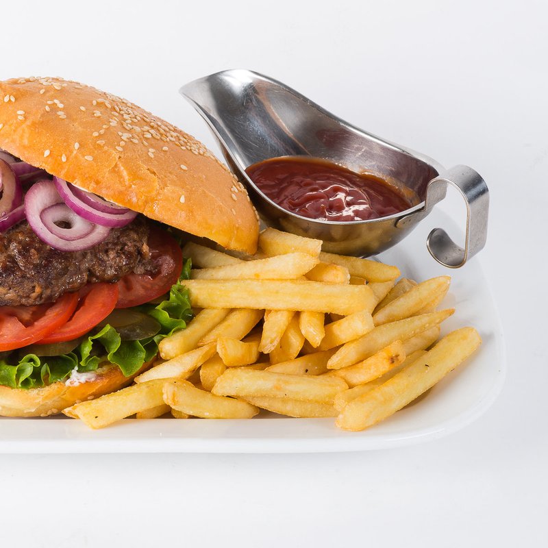 Большой бургер с бифштексом из конины, с салатом айсберг, томатами, красным луком и картофелем фри.