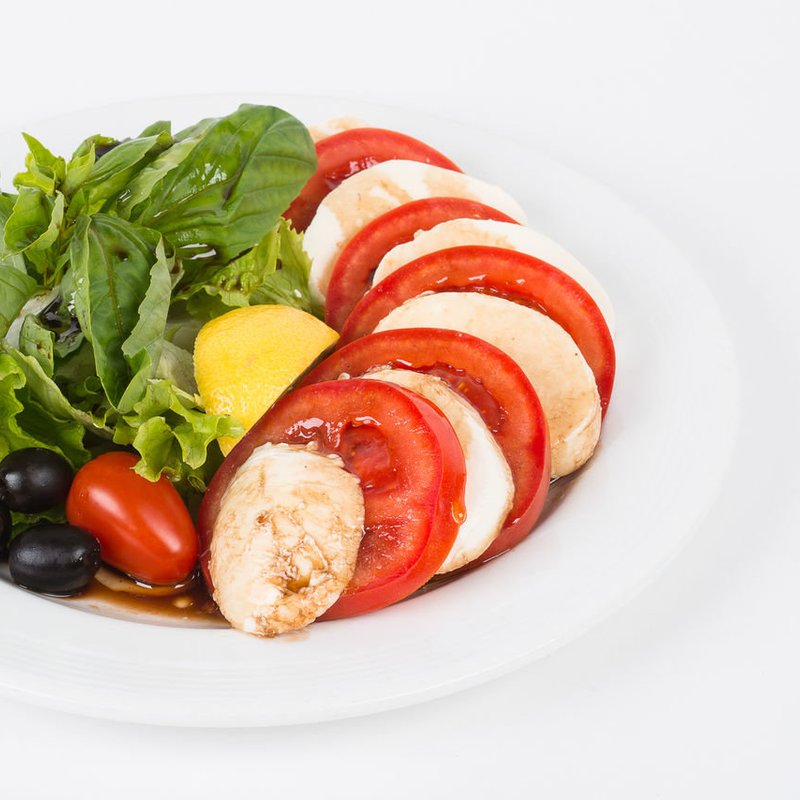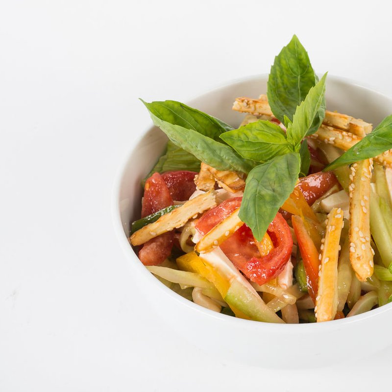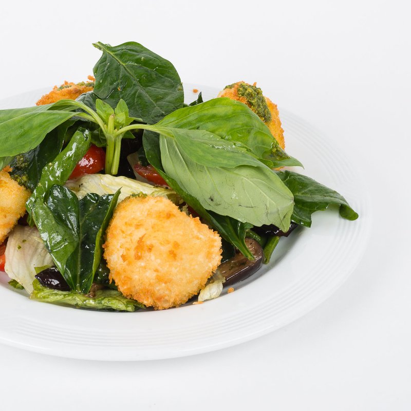 На салате из жареного баклажана с помидором, соусом песто и свежим базиликом.