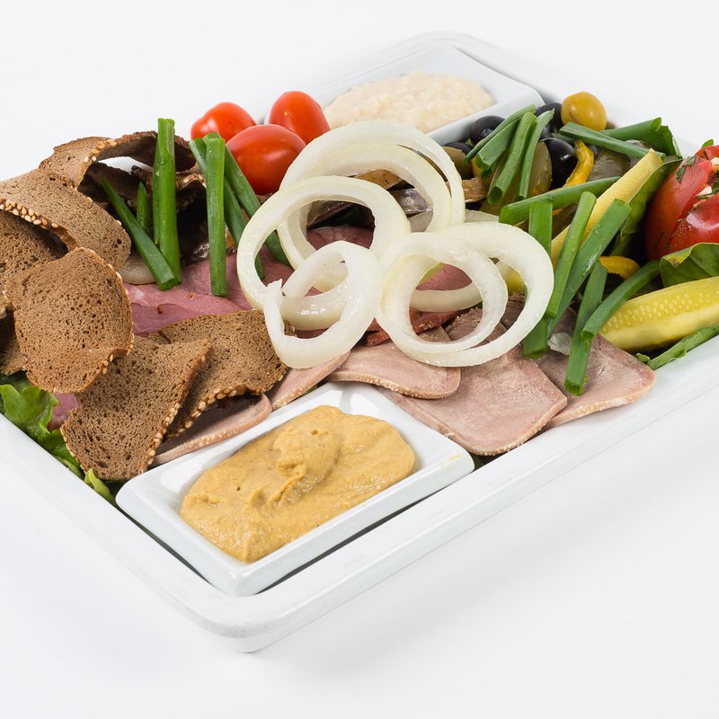 Казы ,жая,говяжий язык с маринованным луком, огурцами и солеными помидорами.