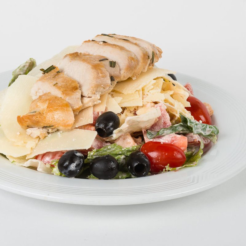 на зеленом салате с помидорками черри, чесночными гренками, под соусом из анчоусов и пармезана