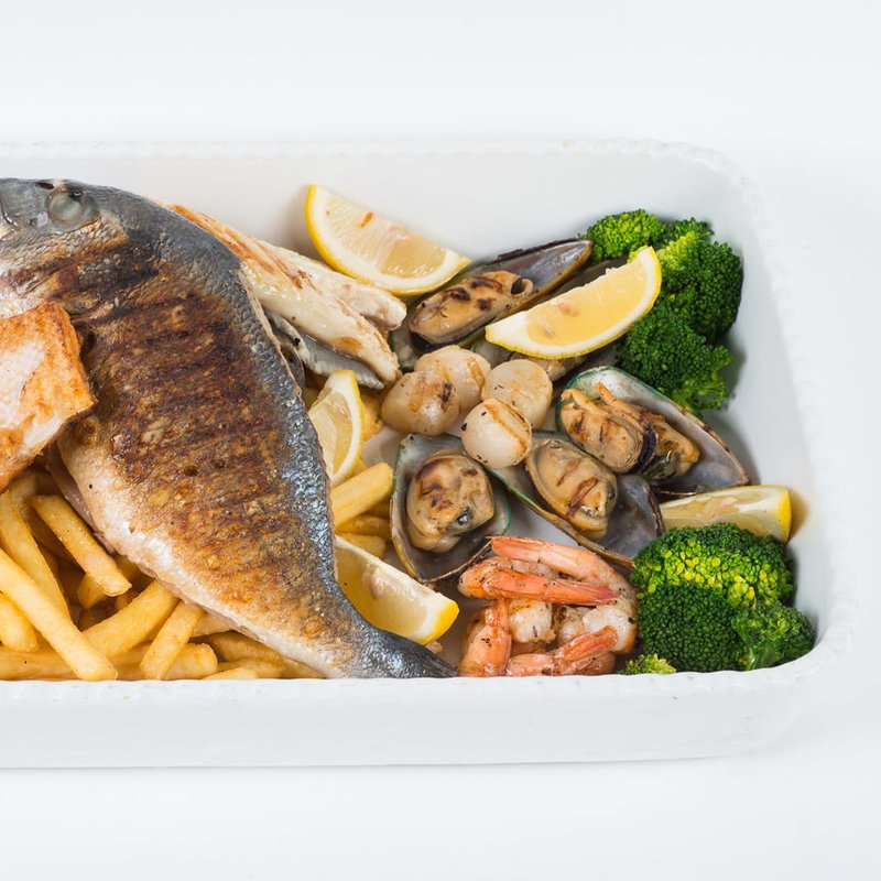 Жаренные на гриле тигровые креветки, морские гребешки,мидии, кебабы из лосося и палтуса,дорадо на гриле...