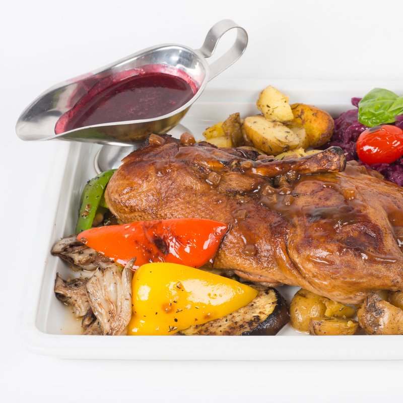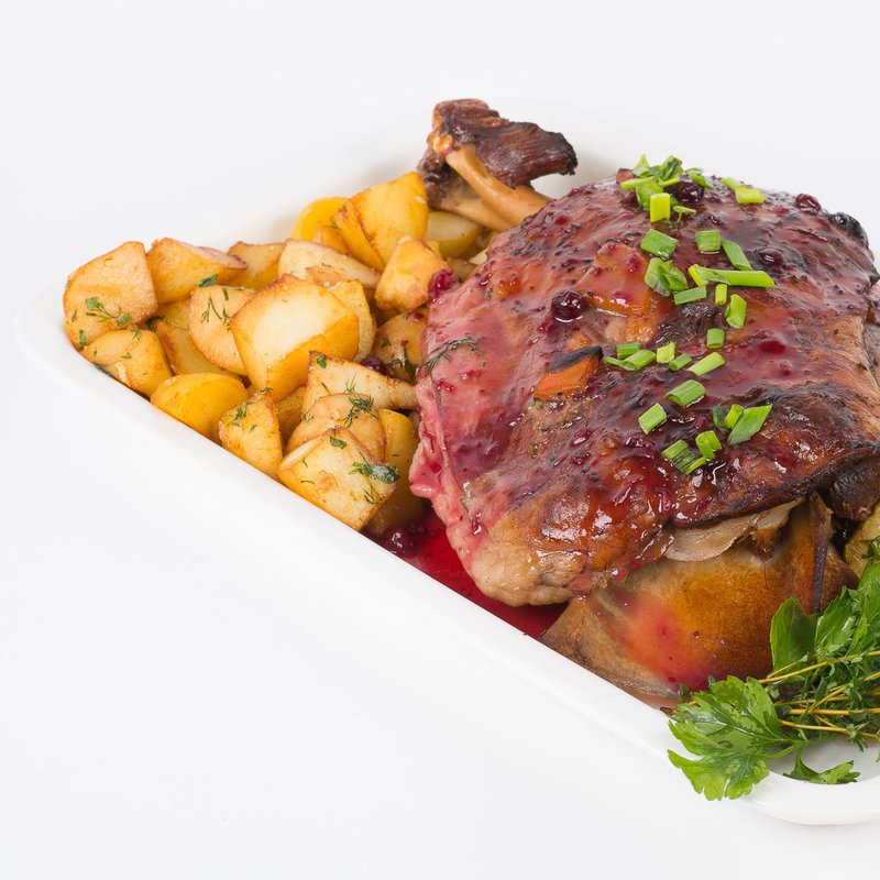 Приготовленная в грушах и бренди подается с тушенной красной капустой обжаренным картофелем и клюквенным...