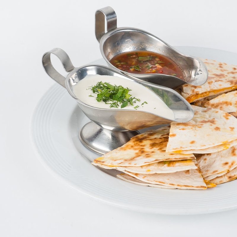 Кесадильос с острым перчиком, курицей и сыром чеддер. Подается с соусом сальса и сметаной