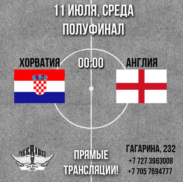 Полуфинал Чемпионата Мира 2018! Приглашаем всех смотреть футбол вместе в Pub Freerider! Хорватия - Англия прямые трансляции на пяти больших экранах! пр. Гагарина, 232, уг.ул. Байкадамова (Кихтенко)
