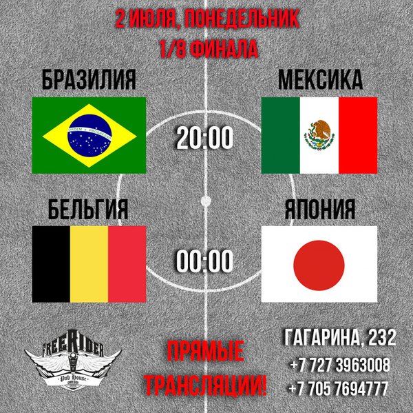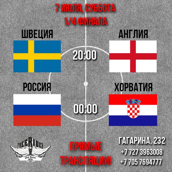 Смотрим Полуфинал Чемпионата Мира 2018! Приглашаем всех смотреть футбол вместе в Pub Freerider! прямые трансляции на пяти больших экранах! пр. Гагарина, 232, уг.ул. Байкадамова (Кихтенко)