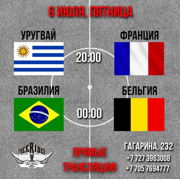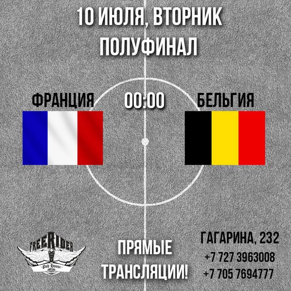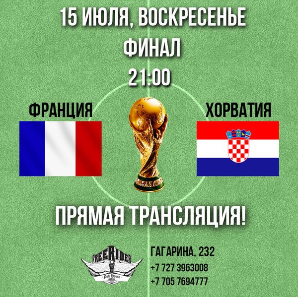ФИНАЛ самого непредсказуемого Чемпионата Мира по футболу! 15 июля, в воскресенье, приглашаем всех смотреть вместе в Pub Freerider! Франция - Хорватия прямые трансляции на пяти больших экранах! ⏰ 21.00 пр. Гагарина, 232, уг.ул. Байкадамова (Кихтенко)