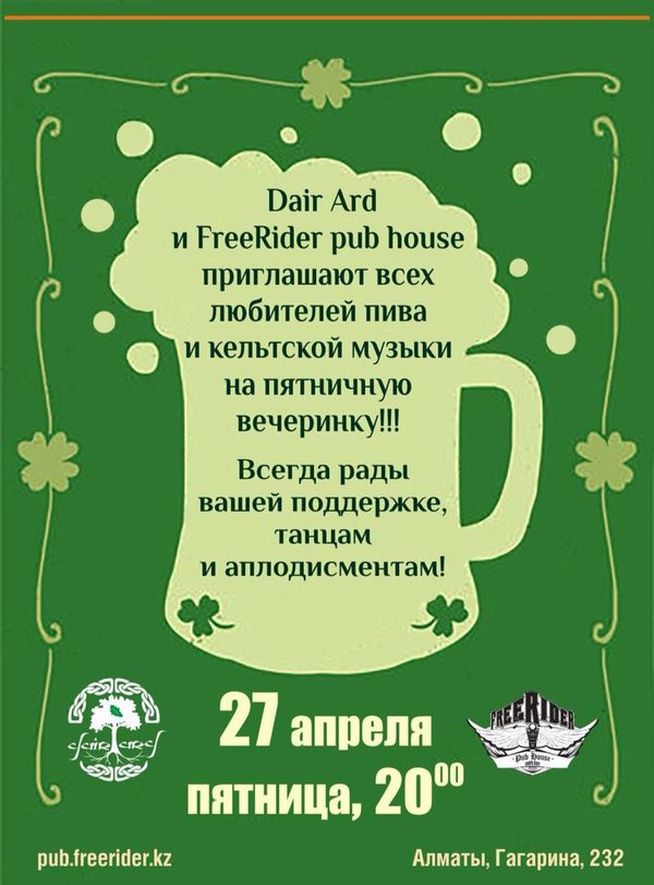 Ставшие традиционными вечеринки кельтской и ирландской музыки! В #пятницу, 27 апреля, на сцене Pub Freerider группа Dair Ard! Начало в 20.00 Наш адрес: Гагарина, 232