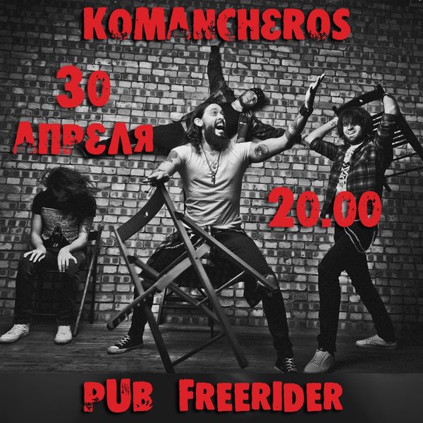 Испугались погоды? В Pub Freerider бояться нечего, ведь на нашей сцене будет жарко! 30 апреля, в 20.00, Komancheros, великие и ужасные, устраивают драйв и рок-н-ролл Репетируем открытие Мотосезона-2017, угощаемся велкам-дринком и зажигаем с друзьями и единомышленниками в стенах Первого Мотоциклетного!