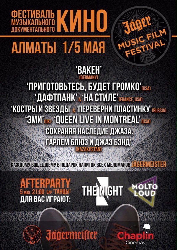Фестиваль музыкального документального кино Jager Musiс Film Festival пройдет в Алматы в кинотеатре Chaplin Mega Park с 1 по 5 мая! Впервые в Казахстане — фильм-концерт о крупнейшем в мире рок-фестивале Wacken в 3D, озвученный Михаилом Козыревым и Тутой Ларсен. А еще — эксклюзивный показ концерта Queen in Montreal! И многое, многое другое! Полная программа и билеты уже на сайте Приходите – будет интересно!
