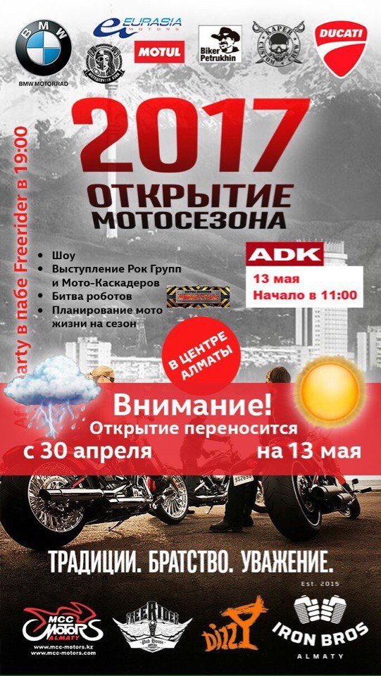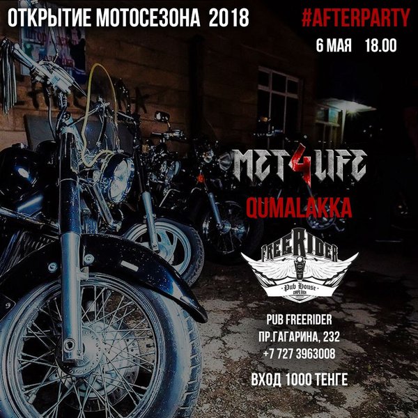 Главное событие весны! Открытие Мотосезона 2018 и #afterparty в Pub Freerider! Музыка: кавер-метал-группа #Met4Life и Qumalakka Настроение: при входе на выбор 2 кружки фирменного #FREERIDERbeer или шот виски или водки от @perepelka.kz Атмосфера: фирменная от первого мотоциклетного Вход 1000 тенге Предварительное бронирование Наш адрес: Гагарина, 232 (уг.ул.Байкадамова)