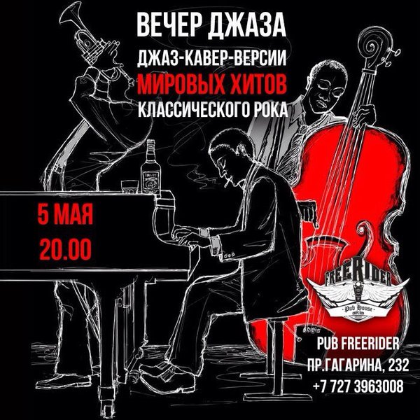 Такого вы еще не слышали Впервые на сцене Pub Freerider рок-композиции в джазовой обработке — Sting, Dire Straits, Chris Rea, Eagles, Phil Collins, Bee Gees и многие другие 5 мая, #суббота, 20.00 Наш адрес: Гагарина, 232 (уг.ул.Байкадамова)