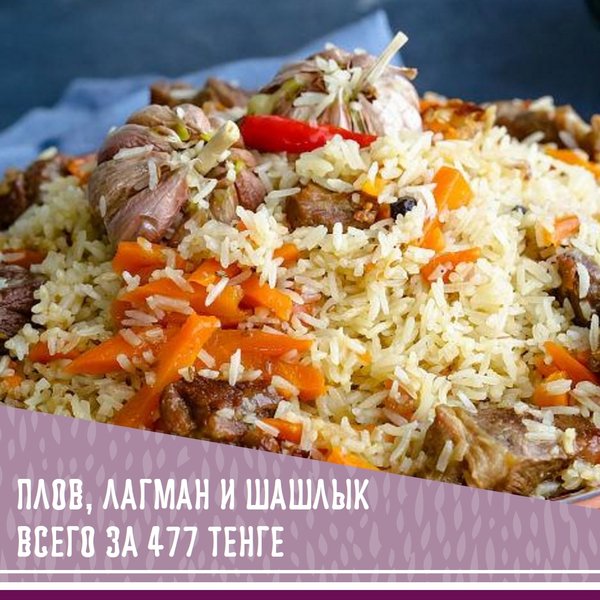 Сытный плов, сочный шашлык и вкусный лагман По лучшим рецептам из разных стран И лучшей цене в Алма-Ате Всего за 477 родных тенге! Потрясающее предложение для вашего застолья Действует каждый день