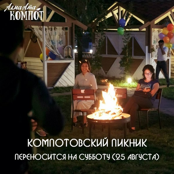 Друзья, важная информация По техническим причинам Компотовский Пикник переносится на субботу (25 августа) Программа Пикника остается такой же: песни у костра под гитару, угощение в виде коктала, игры от Perepelka.kz Сегодня «Алма-Ата Компот» работает в обычном режиме, ждем на посиделки