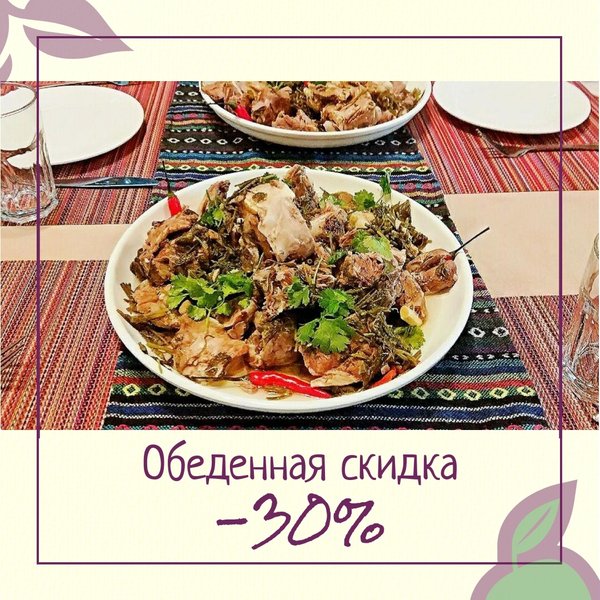 Кухня у нас замечательная и в обед скидка выгодная действует! 30% на все меню (кроме акционных позиций) по будням с 12:00 до 15:00 А это: Борщец всего за 595 тенге; Уха за 560 тенге; Оливьешка за 630 тенге; Хе из баклажанов за 630 тенге; Мантушки за 560 тенге; Хинкали за 770 тенге; Меню обширное, цены вкусные, вид из окна шикарный