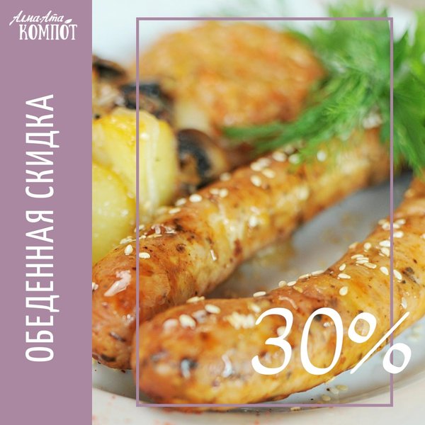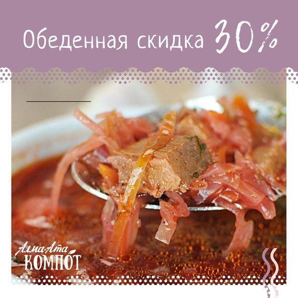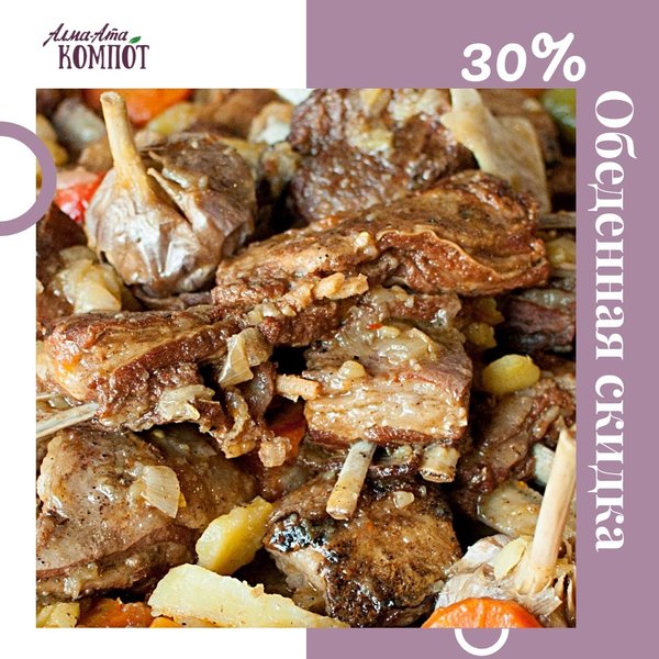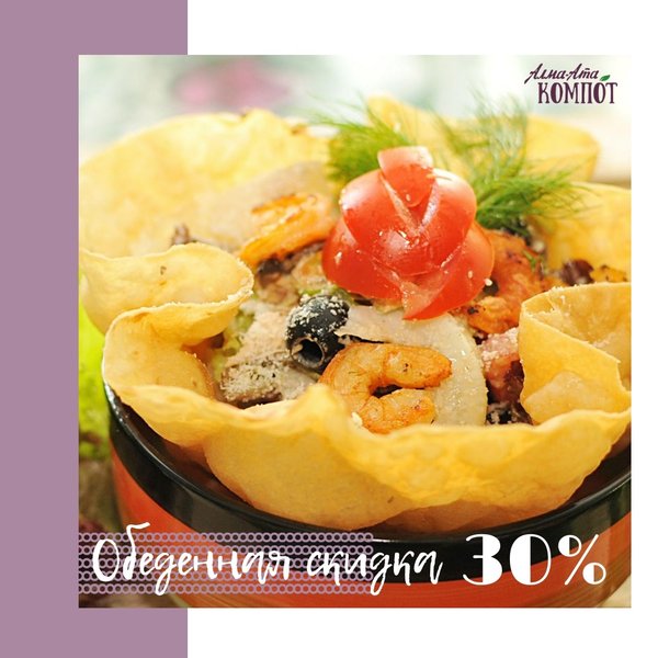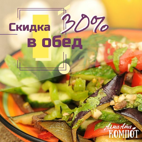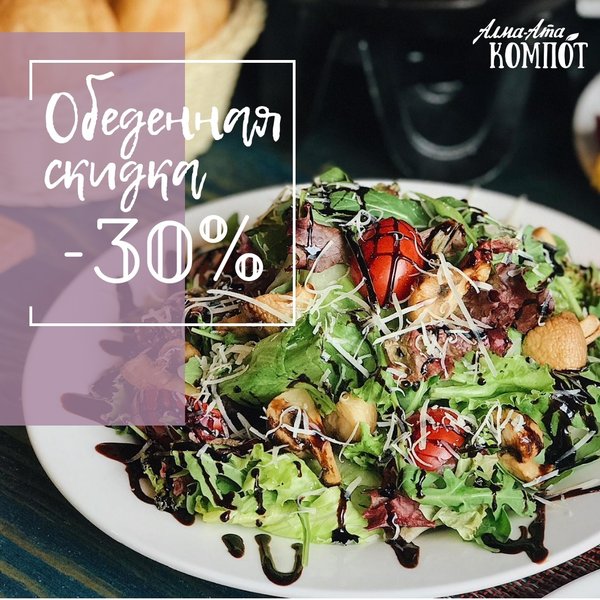 Всем, кто не приемлет фастфуд или лапшу в стаканчике, всем кто привык вкусно обедать, пригодится следующая информация В любимом «Алма-Ата Компот» по будням с 12:00 до 15:00 феноменальная скидка на все меню в целых 30% Бесконечное удовольствие для желудка и для кошелька Гостеприимная поляна для семейных пикников и дружеских посиделок «Алма-Ата Компот» : г. Алматы, мкрн. Кок-Тобе, ул. Сагадата Нурмагамбетова, 28 (пересечение ВОАД и ул. Диваева)