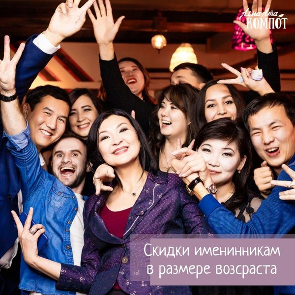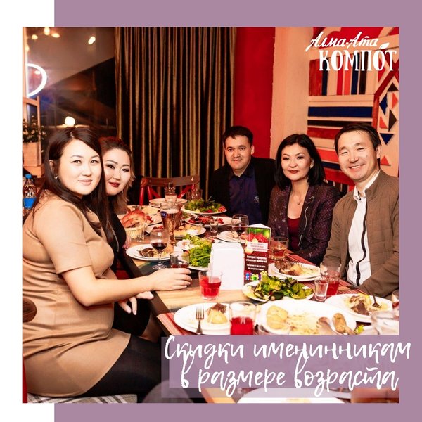 Гостеприимная полянка «Алма-Ата Компот» вновь предлагает крутые условия для именинников и по другим поводам гуляющих Если ты именинник, встречаешься с выпускниками, празднуешь годовщину свадьбы, организуешь мальчишник или девичник: Забирай скидку 20% в будни, 15% в выходные и праздничные дни! Если ты юбиляр: Забирай удвоенную скидку! Бонус для всех При заказе на сумму в 6000 тенге на персону, вы получаете уникальную возможность принести свой алкоголь Подробности по номеру: