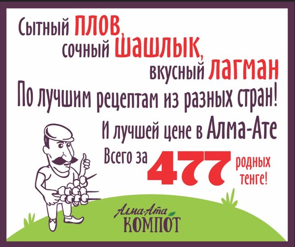 Сытный плов, сочный шашлык и вкусный лагман По лучшим рецептам из разных стран И лучшей цене в Алма-Ате Всего за 477 родных тенге! Акция действует каждый день Приезжайте на самую гостеприимную полянку «Алма-Ата Компот» : г. Алматы, мкрн. Кок-Тобе, ул. Сагадата Нурмагамбетова, 28 (пересечение ВОАД и ул. Диваева)
