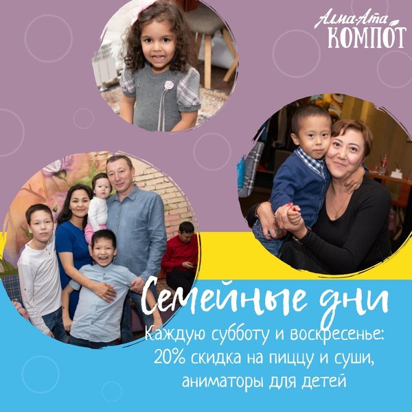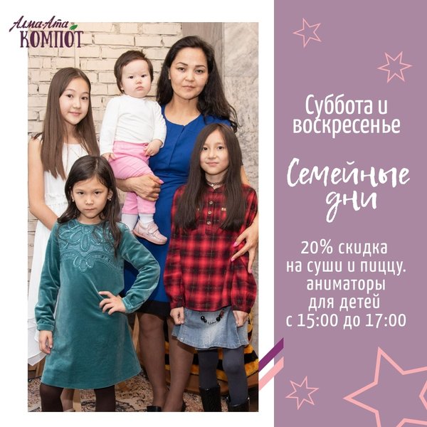 Интересная информация для детишек и их родителей, которые любят увлекательно проводить свой досуг Каждую субботу и воскресенье в «Алма-Ата Компот» семейные дни Днем для малышей работают энергичные и озорные аниматоры. У нас есть отельный зал и его шумно разносит эта ватага Еще скидочка 20% действует на суши и пиццу А вечером живая музыка зажигательная Заинтересовались? Телефон для резерва: