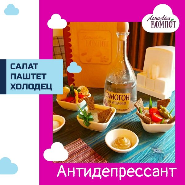 Вокруг осень золотая, а все какие-то грустненькие ходят… Чтобы исправить ваше настроение мы изобрели волшебный АНТИДЕПРЕССАНТ! Теперь в «Алма-Ата Компот» при заказе абсолютно любой водочки бутылкой мы сразу подадим смачную закуску В ней салат из мякоти баклажанчиков с хрустящими гренками, паштет из куриной печенки, холодец и горчичка Любители крепких напитков по достоинству оценят
