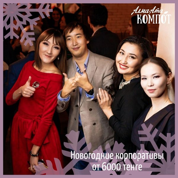 Хорошо весь год работали, нужно «на отлично» отдохнуть! Новогодний корпоратив — самое важное для любой организации мероприятие Поэтому приходи в «Алма-Ата Компот», чтобы быть уверенными, что все будет на высшем уровне Стоимость от 6000 тенге на человека, шоу-программа удивительная, настроение восхитительное Подробности по номеру: