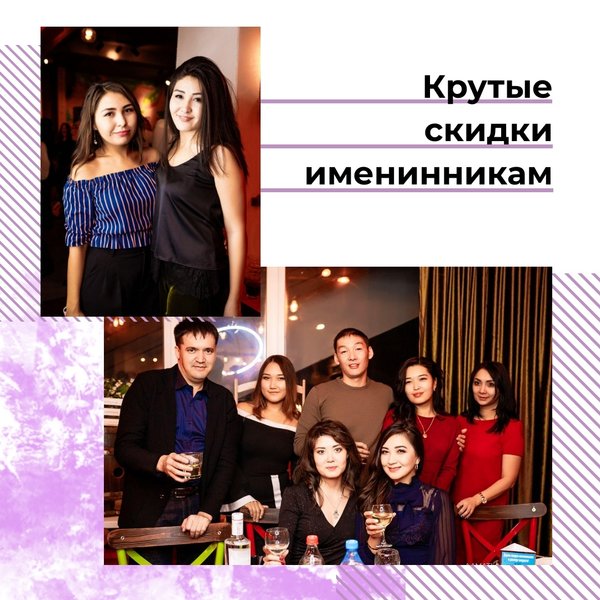 В Новом Году новые условия для ваших особенных событий! Для всех: Набираете по кухне на 6000 тенге на персону, получаете уникальную возможность принести свой алкоголь Для именинников, встреч выпускников (школ, ВУЗ-ов, колледжей), мальчишников и девичников, отмечающих годовщины свадеб: 20% скидка в будни, 15% скидка в выходные и праздничные дни Для юбиляров: скидка удваивается Подробности по номеру: