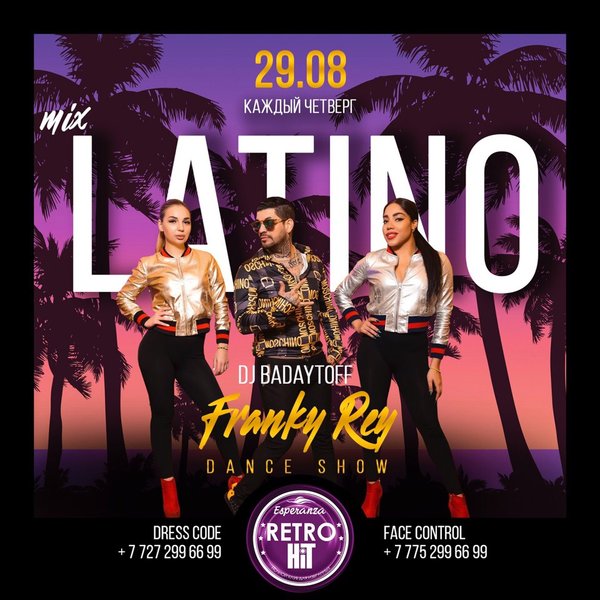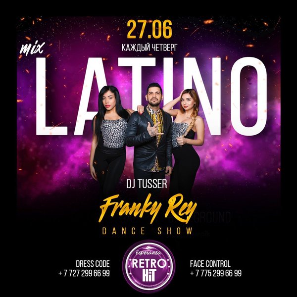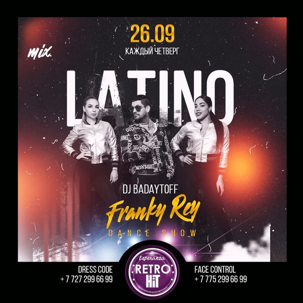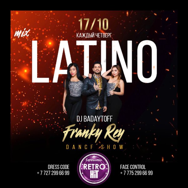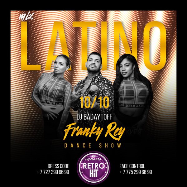MIX LATINO — это завораживающее зрелище, ураганная смесь из страсти, нежности и чувственности Не пропусти В этот четверг горячие танцы вместе с группой Franky Rey . _____ Dj Badaytoff @badaytoff Franky Rey @franky_rey_official _______ Начало в 22:00 FC/DC ул.Сейфуллина 481 .