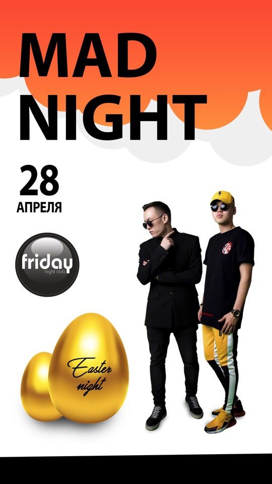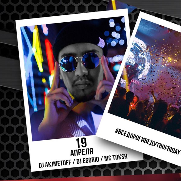 Один танцпол, три бара и танцы до самого рассвета — всё как мы любим Ждём тебя в ночном клубе Friday. Встречай выходные с нами! В Режиме NON STOP пятница и суббота до 08:00 утра Welcome Drink для девушек за баром бесплатно до 01:00 Каждую пятницу и субботу до 00:00 действует скидка 20% на все меню Вход бесплатный до 00:00 ВСЕМ! С 04:00 : 07:00 депозитный вход 3000 тг для парней! __ Dj Akhmetoff @djakhmetoff Dj Egorio #Dj_Egorio Mc Toksh @toksh Ph. Matrizzii @matrizzii ___ Наш адрес: ул.Сейфуллина,481