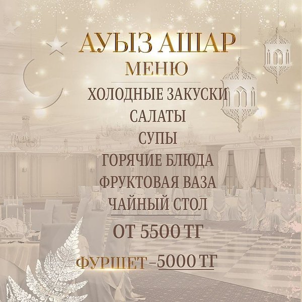Рады сообщить Вам, что принимаем заказы в священный месяц Рамадан на проведение АУЫЗ АШАР. ⠀ Меню от 5500тг с персоны Фуршет от 5000 с персоны ⠀ ул.Сейфуллина 481