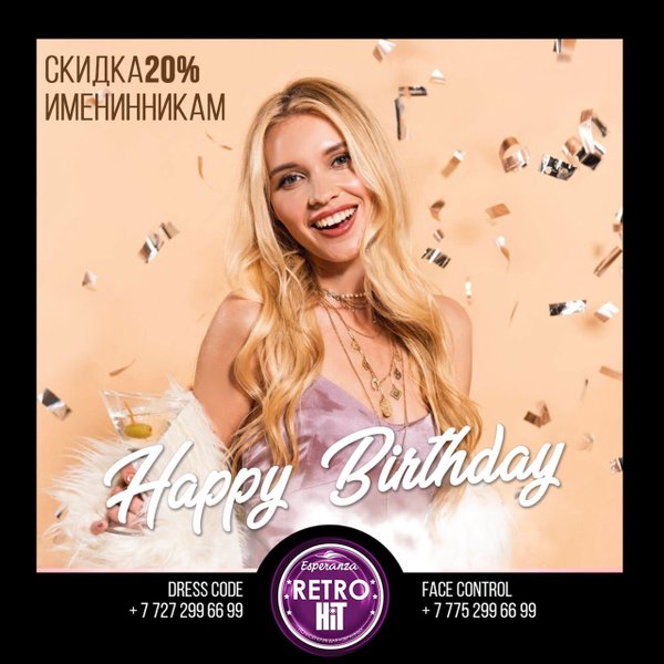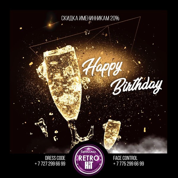 В году существует особенный день. Это день вашего рождения. Мы приглашаем отпраздновать Вас в ночном клубе Retro Hit! Для именинников действует скидка 20%, при наличии дисконт Карты скидка составляет 30%! Начало в 22:00 FC/DC ул.Сейфуллина 481 ️ ️