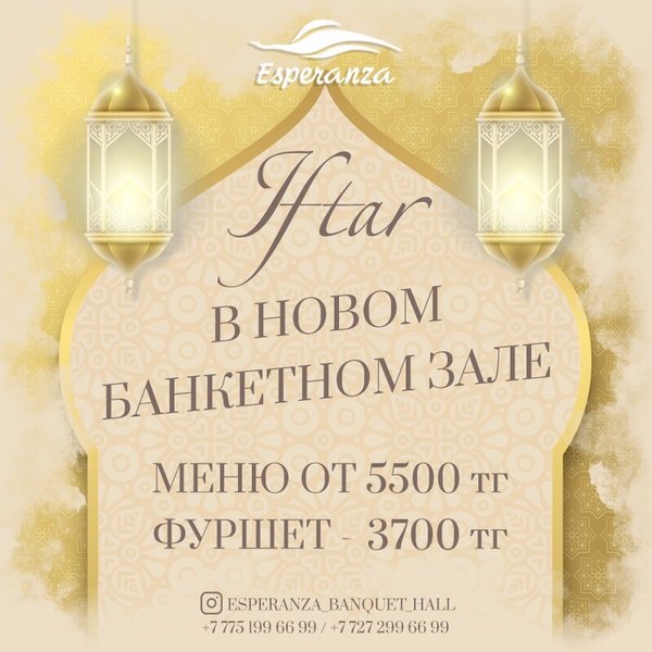 Поздравляем с наступлением священного месяца Рамадан! Пусть этот месяц принесет в каждый дом достаток, счастье, благополучие и согласие! Мы рады сообщить Вам, что принимаем заказы на Ифтар в новом банкетном зале ресторанного комплекса «Esperanza». Проведите вечер в кругу друзей и близких в атмосфере нового, уютного зала и вкусных угощений! @esperanza_banquet_hall Меню от 5500 тг. с персоны. Фуршет 3700 тг. с персоны. Адрес: пр. Сейфуллина 481 Тел.: