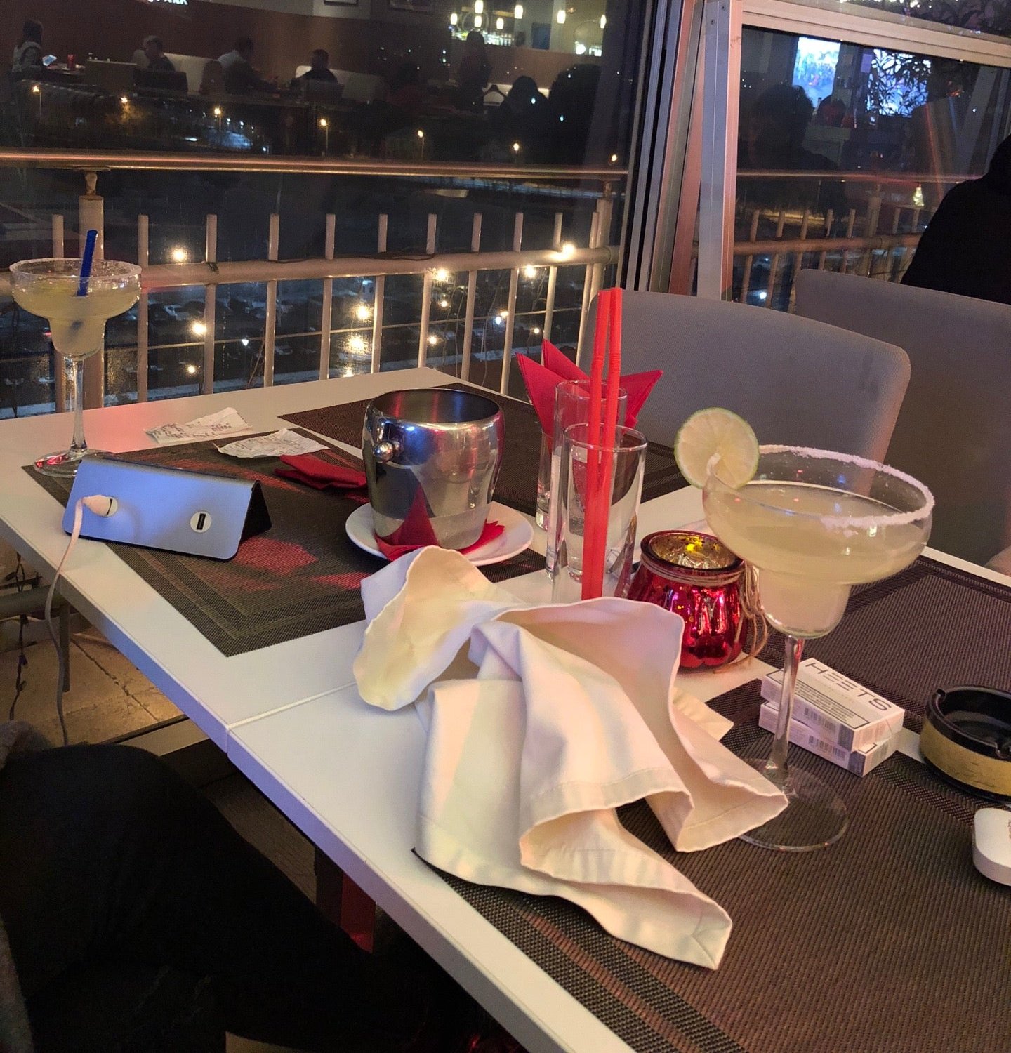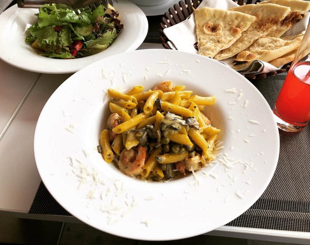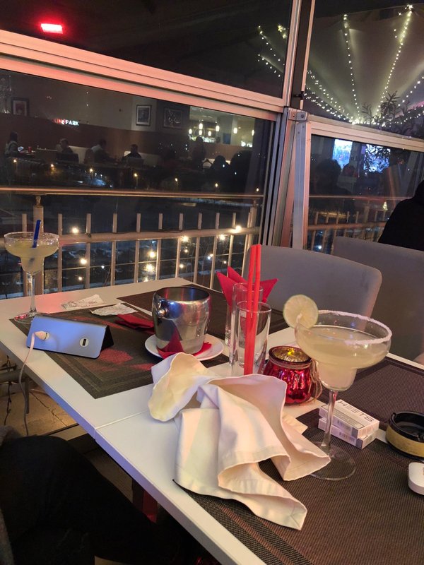 Так себе ничего особенного. Официанты не подошли пока не позвали. Ни приветливости, ни внимательности. Очееееень долгое обслуживание. Ждали бизнес ланч 30 минут!!! Гамбургер 40 минут!!! Вид ну вид, у меня из окна такой же. Уж тогда лучше на КокТюбе или этажом ниже. Там хоть поесть можно. Зато очень шумно от автомобилей и загазованность. Никакого тумана не делали при 30 градусной жаре. Ощущение что кафе создано просто ради создания, а не для клиентов.