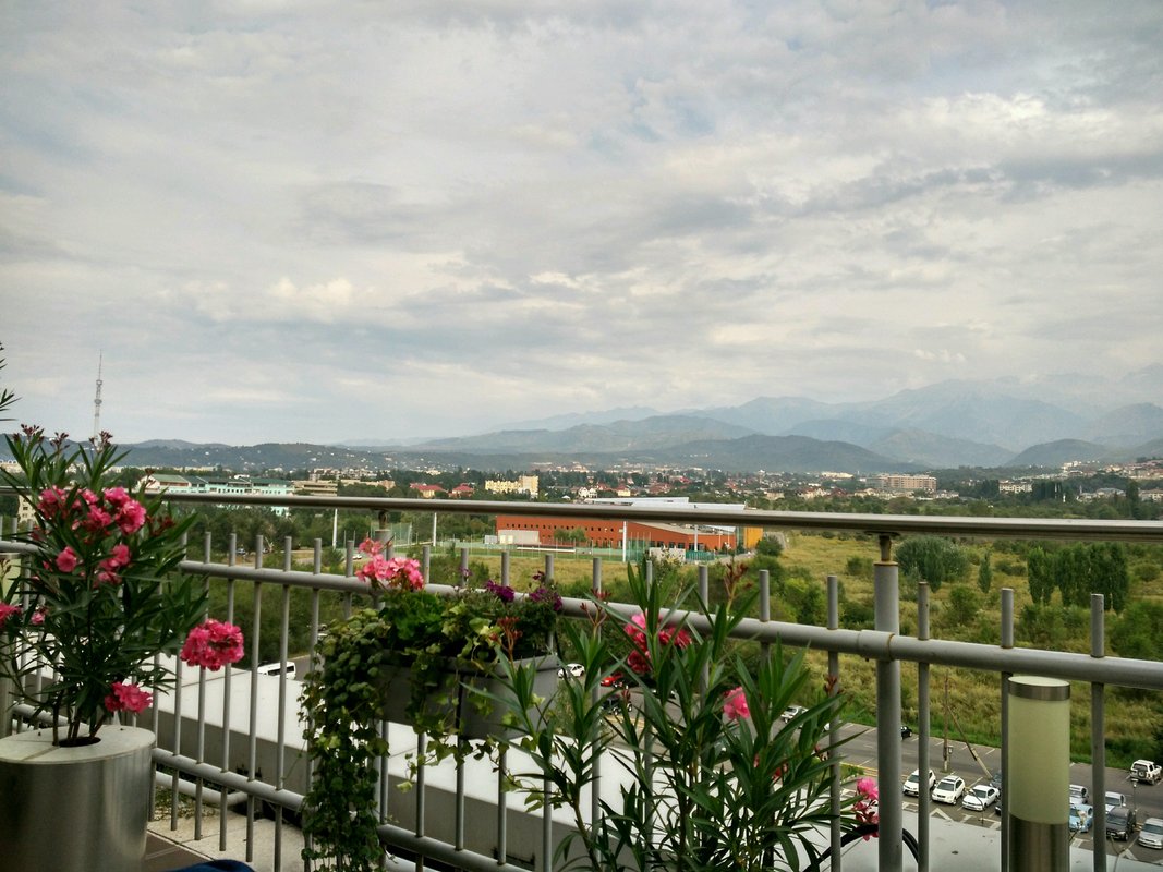 Вид ну вид, у меня из окна такой же. Уж тогда лучше на КокТюбе или этажом ниже. Там хоть поесть можно. Зато очень шумно от автомобилей и загазованность. Никакого тумана не делали при 30 градусной жаре. Ощущение что кафе создано просто ради создания, а не для клиентов.
