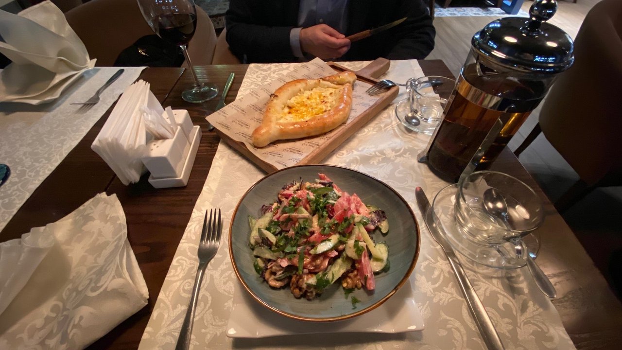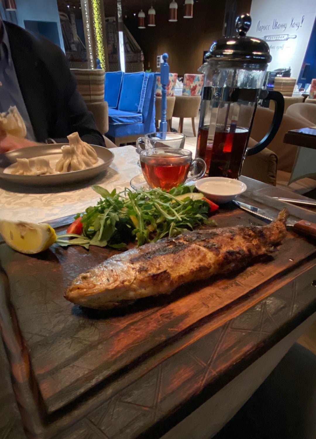 Грузинский салат — лютый, не рекомендую брать, так салаты не делают. Если с острым не в ладах, то и смотреть в его сторону не стоит. Рыба вкусная (форель), чай никакой (местный).