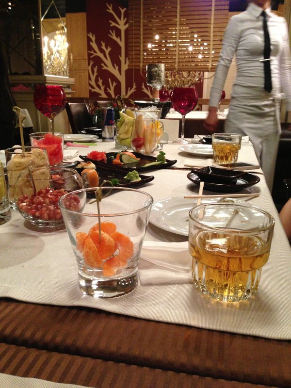 Заказали напитки. Принес не то. Когда заказывали блюда, заставили записать и дважды повторить записанное, записывал на бумажной салфетке. В результате салаты принесли через час, ещё через 20 минут закуски (темпуру так и не принесли). Ещё через час принесли мясные блюда : одно с холодным гарниром, а от другого пришлось отказаться — мясо было пересушено и не съедобно. Ну а когда родители закончили, нам подали долгожданные роллы (2 блюда из 4-х). Здесь терпение лопнуло!!! Администратор, как оказалось, он же метрдотель хорошо, что «извините» пробубнил…