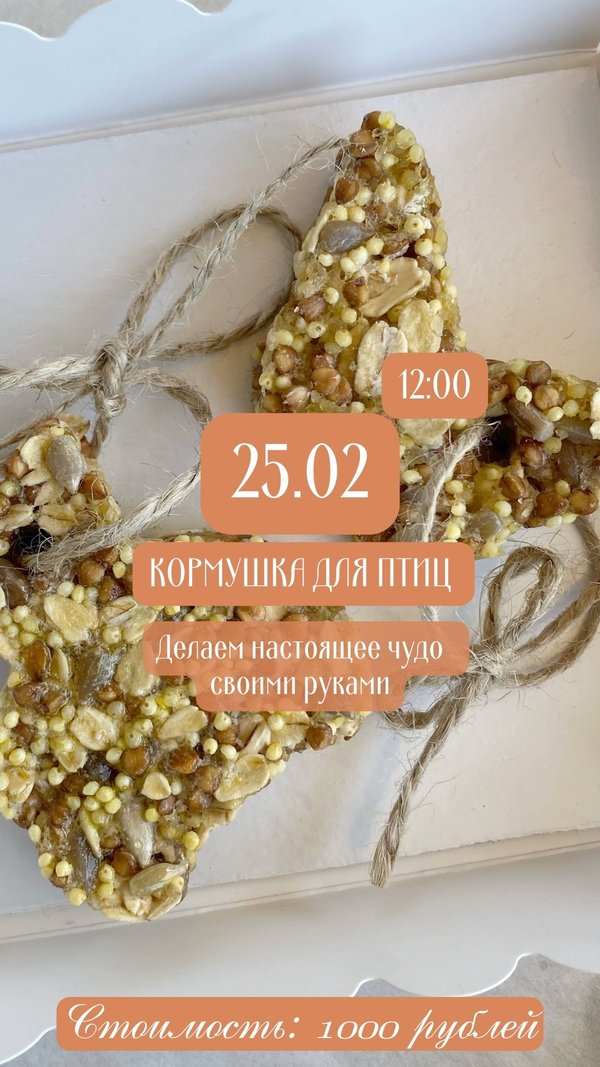 Уже в это воскресенье в 12:00 мы приглашаем вас на невероятно увлекательный и полезный мастер-класс, на котором участники сделают съедобную кормушку для птиц Вместе с ребятами мы будем развивать не только творческое мышление, но и расширять знания детей о природе и ее богатстве! Ребята узнают, какие птицы часто посещают кормушки и какую пищу предпочитают. Это важный шаг для формирования заботливого отношения к окружающей среде ️ ️ Узнать подробнее и записаться можно тут
