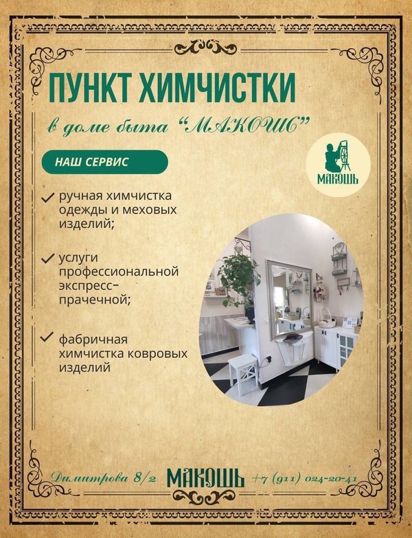 Дом Быта «МАКОШЬ» (12.07.2024): Дорогие друзья! Напоминаем о том, что в нашем ателье работает пункт ХИМЧИСТКИ Наши опытные специалисты заботятся о каждой детали и используют инновационные методы, чтобы обеспечить максимальную эффективность чистки, сохраняя качество и цвет вашей одежды С радостью проконсультируем вас по всем вопросам по номеру