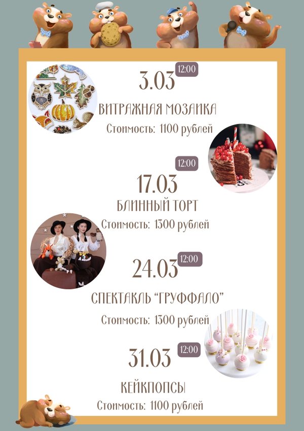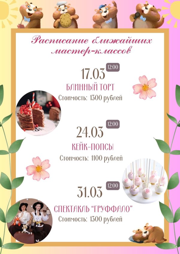 Ближайшие мероприятия (небольшие изменения в расписании): 17.03 в 12:00 — «Блинный торт» 24.03 в 12:00 — «Кейк-попсы» 31.03 в 12:00 — Спектакль «Груффало» Для записи личные сообщений или номер: / WhatsApp)