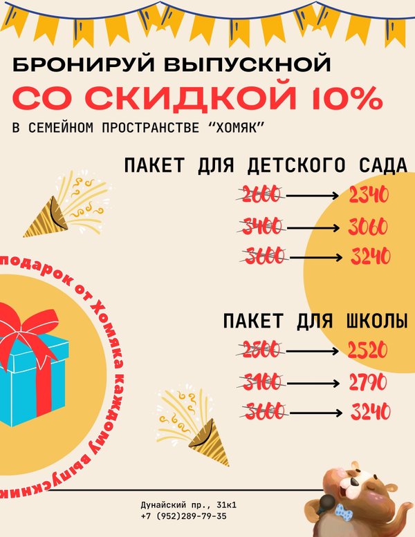 Спасибо за ваши отзывы ️ Что такое семейное пространство «Хомяк»? Место, где живут ваши эмоции и уже более 10-ти лет создаются лучшие праздники для всей семьи! детские и взрослые дни рождения: мастер-классы и спектакли; классные часы; годовасие; выпускные; свадьбы, корпоративы и другие тематические мероприятия. Для заказа праздника и подробной информации пишите в сообщения сообщества ️ Наш адрес: Дунайский проспект, 31к1 (м.Купчино) Наш телефон: / WhatsApp)