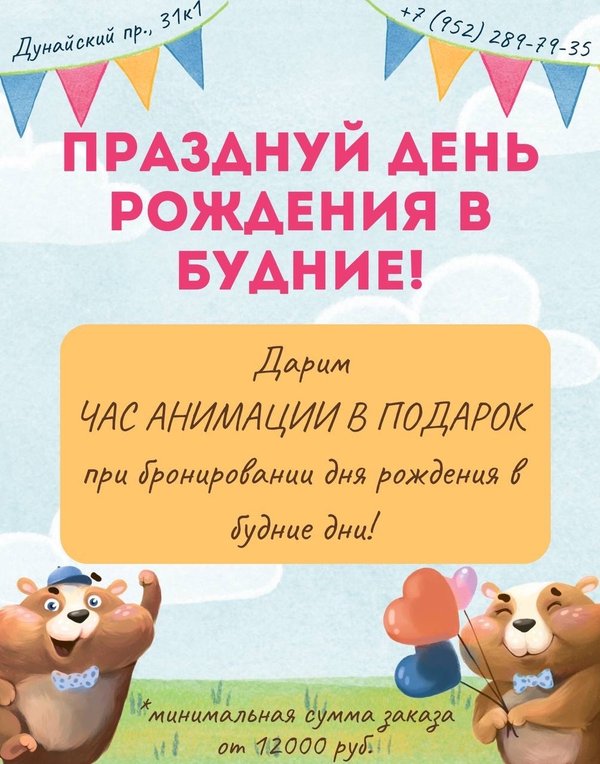 День рождения в будние? Не откладывай на выходные, празднуй день в день и забирай наши ПОДАРКИ Час анимации в подарок Ознакомиться с другими летними акциями и узнать все подробности вы можете у администратора по номеру