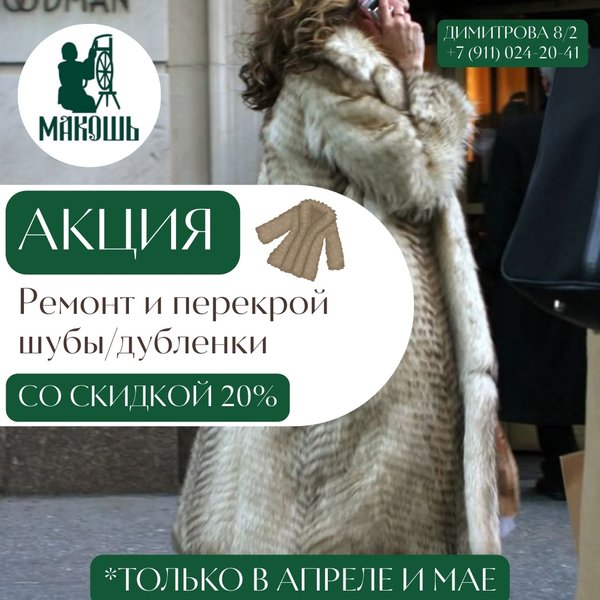 Дом Быта «МАКОШЬ» (30.03.2025): ТОЛЬКО В АПРЕЛЕ И МАЕ! Скидка 20% на ремонт и перекрой шубы/дубленки «Готовь сани летом » Подготовьтесь к зиме заранее вместе с домом быта «Макошь»! Ждем вас по адресу Димитрова 8/2 :