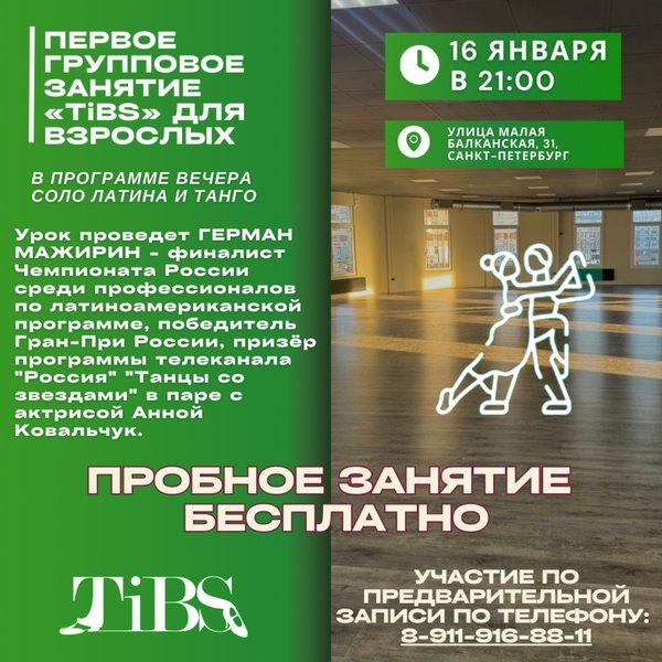 Танцевальный зал «TiBS» бальные танцы (09.01.2025): Приглашаем любителей танца на первое групповое занятие «TiBS» для взрослых! В программе вечера СОЛО ЛАТИНА и ТАНГО ️ 16 января в 21:00 Урок проведет ГЕРМАН МАЖИРИН — финалист Чемпионата России среди профессионалов по латиноамериканской программе, победитель Гран-При России, призёр программы телеканала «Россия» «Танцы со звездами» в паре с актрисой Анной Ковальчук. Танцевальный вечер пройдет в сопровождении профессиональных ассистентов — действующих танцоров, которые помогут закрепить на… — Читать дальше