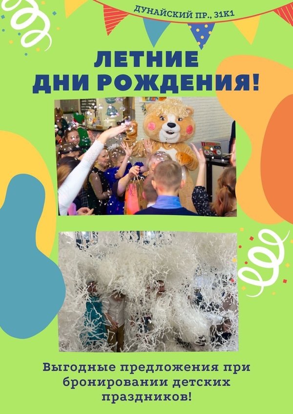 лючительно на ваших предпочтениях; ~ У нас есть все составляющие для идеального праздника: стильный современный зал, большое количество шоу-программ для детей разного возраста, детское и взрослое меню, торт, шары. И это лишь малая часть того, что мы можем предложить; ~ Мы проводим не только детские праздники, но и юбилеи, свадьбы, семейные мастер-классы; ~ Замечательный персонал: сервис на высшем уровне (2 официанта на мероприятии для вашего комфорта), администратор, шеф-повар, лучшие артисты и ведущие города; Если остались вопросы, то мы обязательно на них ответим в комментариях или личных сообщениях! Ждём Вас по адресу: Дунайский пр., 31к1