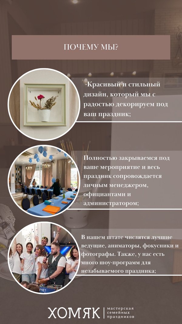 Праздники для взрослых в семейном пространстве «Хомяк» Возможно всё! Более 10-ти лет создаем различные мероприятия для взрослых: дни рождения и юбилеи, свадьбы, корпоративы, тематические вечеринки, выпускные для старшеклассников, мастер-классы и развлекательные программы; С радостью проконсультируем вас по всем вопросам и познакомим с нашей командой и пространством ️ Ждем по адресу Дунайский пр., 31к1, также для связи личные сообщения или номер